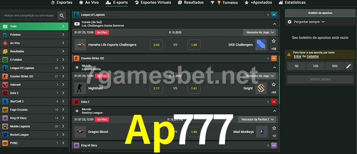 O Ap777 oferece uma grande seleção de opções de apostas em e-sports com probabilidades competitivas
